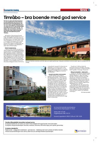 Timråbo – bra boende med god service För fem år sedan gick Timrå kommun ut med ambitionen att till år 2015 ha Norrlands bästa företagarklimat. Det har man redan uppnått. Målsättningen var också att till 2015 öka befolkningen med 500 personer. Det är på väg. – Vi hjälper den som behöver, att finna en bostad eller lokal enligt önskemål, säger VD Lotta Björklund på AB Timråbo. AB Timråbo är Timrå kommuns bostadsbolag. Närheten till både Sundsvall och t.ex. de många arbetstillfällena i Birsta köpcentrum, på bara några minuters avstånd, gör boende i Timrå både i hyreslägenhet och i villa attraktivt. Med ca 130 miljoner hyresintäkter och en vinstnivå på ca 2 miljoner per år, har Timråbo skapat utrymme för de åtgärder och förbättringar som behövs nu och framöver. Lotta Björklund är sedan i fjol ny VD för Timråbo. Välskött fastighetsbolag