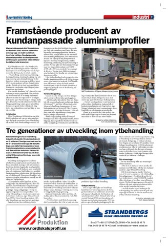 framtagning av den helt förädlade slutprodukten. Tack vare samarbetet med Purso, där man behandlar återvinningsaluminium, kan man själva ta fram ungefär hälften av det råmaterial som används i produktionen. Det innebär även att man har tillgång till hög kompetens och kapacitet avseende strängpressning, maskinbearbetning, anodisering och pulverlackering av profiler. När det gäller det förstnämnda förfogar man över tre produktionslinjer med 1 650, 2 700 och 3 500 tons presskraft. Sammantaget är det en av Europas mest effektiva och moderna fabriker när det handlar om extrudering av aluminiumprofiler. I den ändamålsenliga bearbetningsverkstaden förädlas aluminiumprofilerna till färdiga komponenter efter kundernas önskemål. NAP Produktions AB besitter, utöver det breda produktionskonceptet, också för teknisk assistans och rådgivning kring allt som rör bearbetning och profiluppbyggnad. Varierande uppdrag Genom åren har Morgan och hans kollegor utfört jobb åt ett flertal olika uppdragsgivare. – Det blir en hel del jobb för Nibe och Aritco Lift AB avseende bearbetade profiler som skickas till slutkund. Vi gör fötter till duschkabiner åt Macro och Swedbergs, komponenter till tomburksautomater som leveras till Polen, levererar strömdistanser till truckar för kunder i USA och Kina samt utför lagerhållning åt Husqvarna, berättar Morgan Johannesson. Bland övriga uppdrag märks till exempel framtagning av delar till grundplattan för permobilgarage, kapningsjobb för Holsby Metall som jobbar på uppdrag av bilindustrin samt tillverkn-