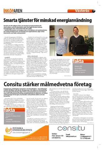 Smarta tjänster för minskad energianvändning Det blir ett allt tydligare fokus på minskad energianvändning för såväl miljöns som för plånbokens skull. Här ligger förstås Svenska Energigruppen AB:s verksamhet helt rätt i tiden. – Genom information och analyser ökar vi förståelsen och medvetenheten hos såväl privatpersoner som företag och organisationer, säger Johan Kvarnström som leder verksamheten. Svenska Energigruppen AB bildades 2006 och arbetar idag rikstäckande med privatpersoner, företag och organisationer som tack vare samarbetet med Svenska Energigruppen bidrar till att minska energianvändningen. – Vår ambition är att hjälpa människor och företag att förstå och effektivisera sin energianvändning. Genom information och analyser skapar vi medvetenhet och ökad kunskap bland våra användare. Dessutom arbetar vi med att effektivisera processer och administration hos såväl energibolag som diverse organisationer, berättar Johan Kvarnström som leder verksamheten. energiinfo Han berättar att man har specialiserat sig på mätning, visualisering, analys och beräkning av energidata för energibranschen (elhandels-, elnäts- och fjärrvärmebolag), fastighetsbranschen, privatägda företag och offentlig sektor. – Vi erbjuder webbaserade lösningar via dator, mobil och surfplatta, men också via våra egna appar, säger Jessica Norman, marknadsförare på Svenska Energigruppen, och nämner tjänsteplattformen energiinfo som hjälper användaren att förstå, analysera och effektivisera den egna energianvändningen.
