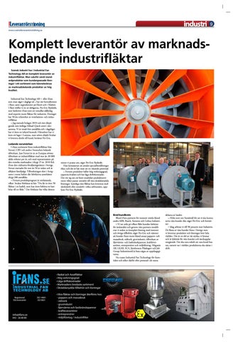 Komplett leverantör av marknadsledande industrifläktar Svensk industri har i Industrial Fan Technology AB en komplett leverantör av industrifläktar. Man saluför såväl standardprodukter som kundanpassade lösningar i ett sortiment som kännetecknas av marknadsledande produkter av hög kvalitet.