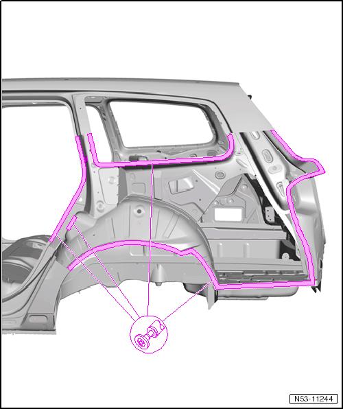 – Weld in parting cuts, MIG solder seam or SG continuous weld seam are permitted. – Reform wheel housing flange. – Wipe away excess adhesive and seal wheel arch.