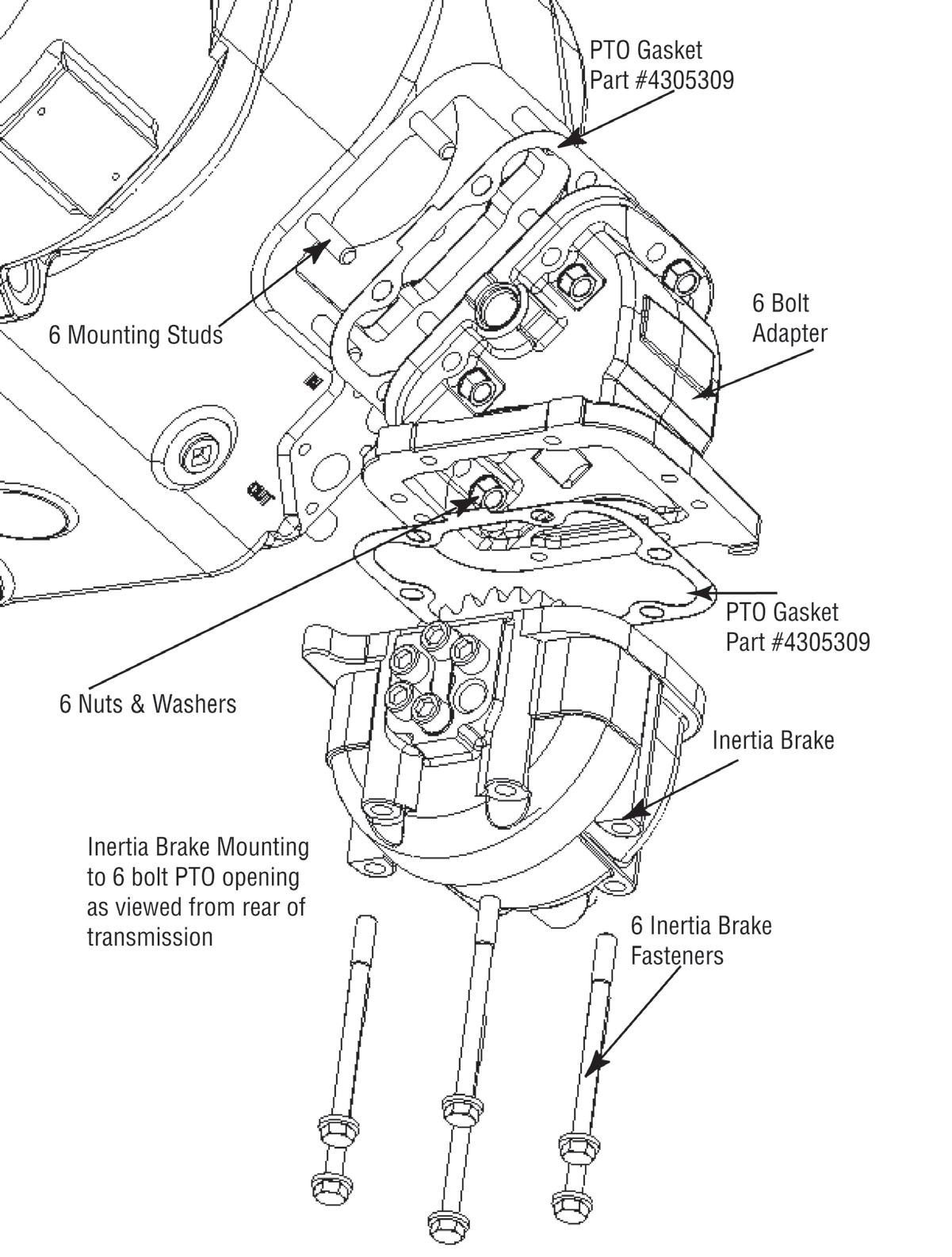 3. Remove the six (6) mounting bolts from the Inertia Brake. 4. Remove the Inertia Brake and gasket from the Adapter Plate. 5. Remove the eight (8) mounting bolts from the Adapter Plate. 6. Remove and discard the Adapter Plate and gasket from the transmission. 7. Remove the six (6) mounting bolts from the 6-bolt PTO cover. 8. Remove and discard the 6-bolt PTO cover and gasket from the transmission.