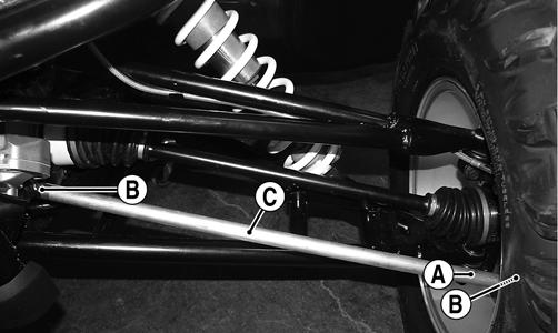 To adjust the wheel alignment, use the following procedure. 1.Center the steering wheel; then using an open-ended wrench on the tie rod flat (A), loosen the inner and outer jam nuts (B) on both tie rods.