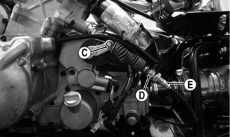 2.From under the vehicle, thread the new cable into position. Do not tie cable tie points yet. 3.Set the upper cable housing end into the mounting bracket and finger tighten jam nut (B); then connect the cable to the shift arm pivot bolt and secure with the nut (A). Tighten the nut to 8 ft-lb. 4.Place the lower cable housing end into the mounting bracket on the engine and finger tighten jam nut (D); then connect cable (E) to the shift arm and install the E-clip (C). 5.Install any necessary cable ties as marked during removal; then adjust the shift cable (see Periodic Maintenance/Tune-Up). After cable is properly adjusted, tighten the jam nuts to 20 ft-lb. 6.Install the center console, battery cover, and seats.