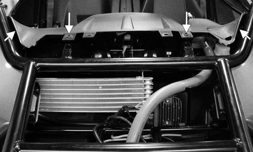 2.Remove two fender screws behind the headlights and two fender screws at the rear of the hood; then remove the hood.