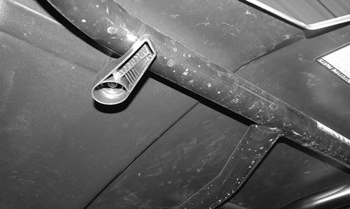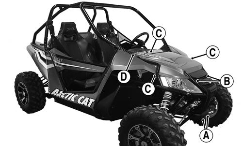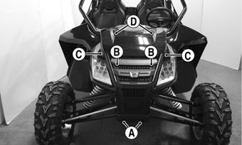 3.Reach up through the front fender wells and remove two fender screws (D) from the rear of the hood and remove the hood. INSTALLING 1.Lay the hood in place on the frame; then install the rear fender screws (D). 2.Install the two side fender screws (C); then place the grille on the vehicle and install the two machine screws (B) and fender screws (A). Tighten all fasteners securely.