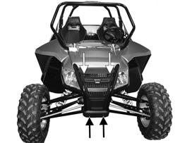 REMOVING 1.Remove the cap screws securing the upper bumper support to the bumper. 2.Remove the bolts and lock nuts securing the bumper to the frame; then remove the bumper CLEANING AND INSPECTING 1.Clean all bumper components with parts-cleaning solvent. 2.Inspect all welds for cracking or bending. INSTALLING 1.Place the front bumper assembly into position and secure using the existing cap screws. Finger-tighten only at this time. 2.Secure the upper bumper support to the bumper using the bolts and new lock nuts. Tighten all hardware to 20 ft-lb.