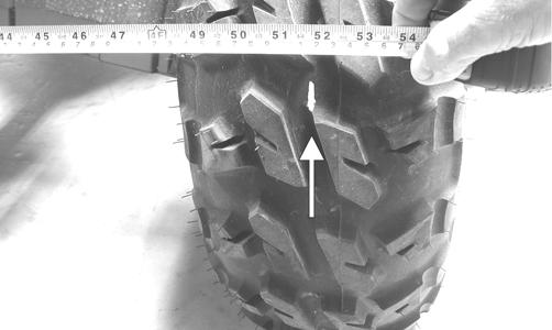 Mark the center-line of the front tires at the front and rear of the tire; then using a tape measure, measure and record the distance between the marks at the front and rear. The front measurement should be 6 mm (1/4 in.) greater than the rear measurement (toe-out).