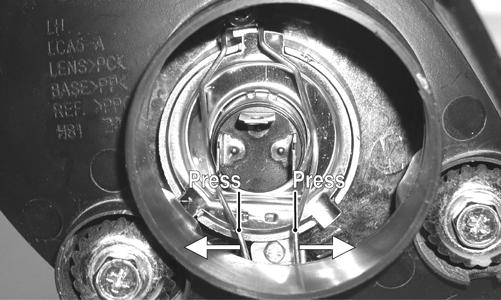 To replace the headlight bulb, use the following procedure. 1.Remove the boot from the back of the headlight housing; then remove the three-wire connector from the bulb. 2.Using care not to bend or deform the spring clip, release the two ends of the spring clip from the light housing; then remove the bulb from the headlight housing.