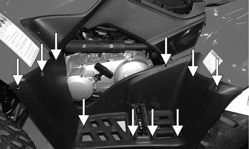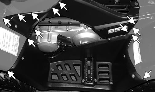 2.Disconnect the negative battery cable first; then the positive cable. 3.Remove the battery hold-down strap; then remove the battery. 4.Remove the front and rear racks; then remove the cap screws securing the front center panel and remove the panel.