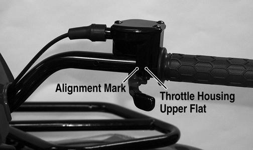 REMOVING 1.Remove the boot from the throttle cable adjuster; then loosen the jam nut and turn the adjuster completely in to loosen the cable. 2.Remove the three machine screws securing the cover to the throttle control; then remove the cover and disengage the throttle cable from the throttle arm. 3.Turn the cable adjuster out of the throttle control housing; then remove the two machine screws securing the throttle control to the handlebar and remove the throttle control. INSTALLING 1.Making sure the throttle housing upper flat aligns with the alignment mark on the handlebar, place the throttle control into position on the handlebar and secure with the two machine screws; then tighten the machine screws securely.