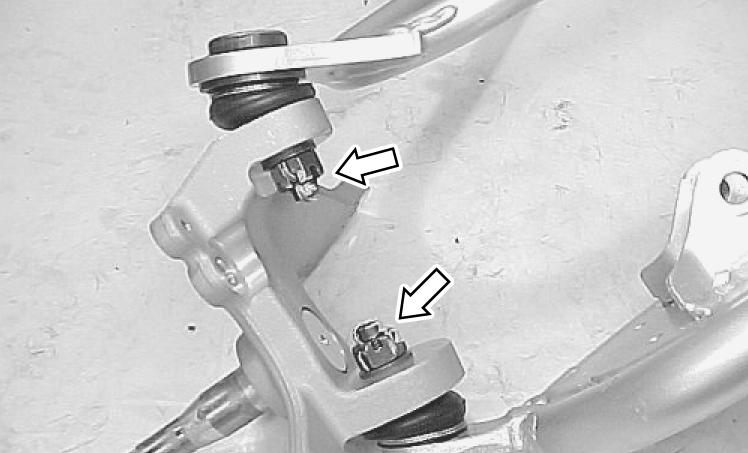 7.Remove the brake hose clamp from the A-arm; then remove the cotter pins and slotted nuts securing the upper and lower ball joints.