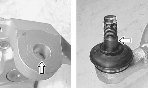 8.Remove the shock absorber mounting cap screws; then remove the shock absorber assembly. 9.Using a ball joint remover, remove the ball joints from the knuckle; then remove the front bumper. CLEANING AND INSPECTING 1.Clean the knuckle in parts-cleaning solvent; then dry with compressed air. If any damage or excessive wear is detected, the knuckle must be replaced. 2.Inspect the ball joint for boot damage or wear.