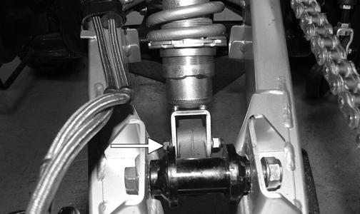 2.Remove the rear shield plate from the swing arm; then remove the lower shock mounting nut and cap screw. ! WARNING