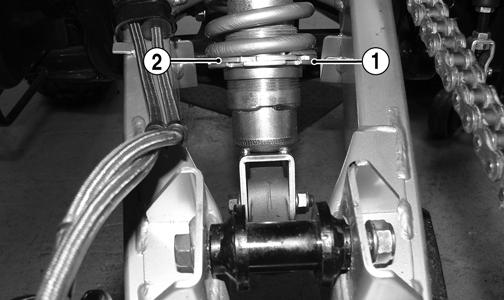 INSTALLING 1.Raise the swing-arm and place the shock absorber in position; then install the upper and lower cap screws and nuts. 2.Tighten the upper nut and the lower nut to 29 ft-lb. 3.Install the rear swing arm skid plate and four cap screws. Tighten securely. ADJUSTING SPRING PRELOAD The rear spring preload is adjustable by changing the spring set length. Using the following procedure, adjust the spring. 1.Loosen the lock nut (1). Adjust the spring preload by turning the adjuster (2) clockwise to increase spring preload or counterclockwise to decrease spring preload.