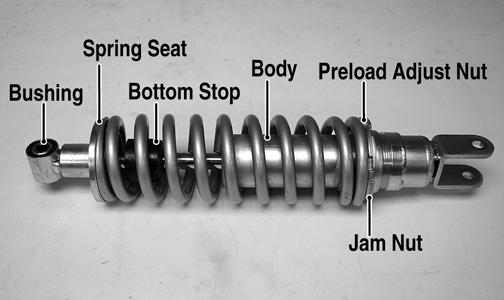 CLEANING AND INSPECTING 1.Clean the shock absorber in parts-cleaning solvent. 2.Inspect the shock absorber body, bottom stop, and rubber bushing for damage and leaking oil. If any defects are found, replace the shock absorber. 3.Inspect the spring, spring seat, and preload adjustment nuts and threads for damage or corrosion. If corrosion is present on the threads, clean with a fine wire brush and oil lightly.