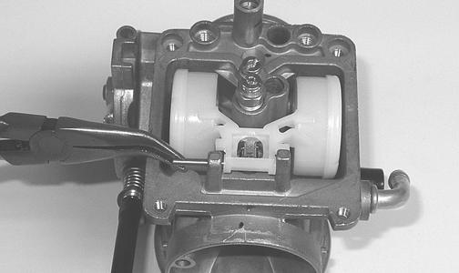 6.Lift the float assembly from the carburetor. Account for the float valve and clip.