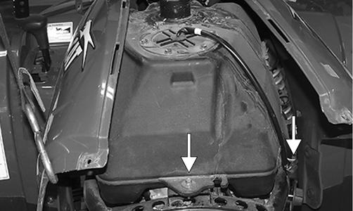 8. Remove the cap screw securing the gas tank to the frame; then unplug the fuel level sensor wires.