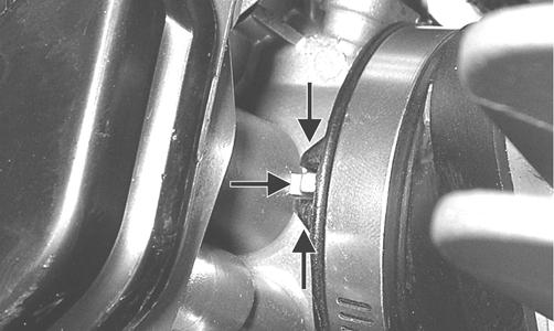 3.Install the carburetor onto the engine making sure the alignment lug on the carburetor is between the two tabs on the air intake pipe; then tighten the clamp securely.