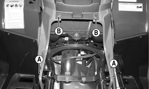 3.Remove the cap screws (A) securing the rear of the front body to the frame; then remove the two reinstallable rivets (B) securing the gas tank cover to the body.