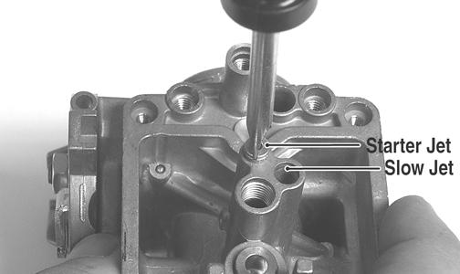 7.Secure the needle jet holder with a wrench; then remove the main jet. 8.Remove the needle jet holder; then remove the needle jet, slow jet, and the starter jet. 9.Remove the pilot screw. Account for a spring, washer, and an O-ring.