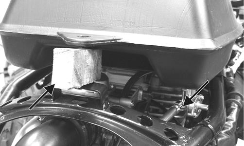 2. Using a suitable block, support the rear of the tank and connect the gasline hose. Secure with the clamp.