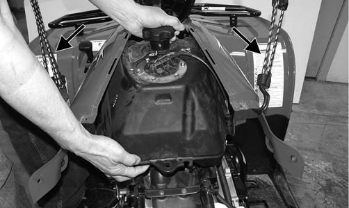 4.Remove the front access panel. 5.Remove the gas tank cap; then remove gas tank cover. Place the cap back on the tank. 6.Using suitable straps, hook the body panel at the rear of the gas tank and route it over the handlebar to the front rack; then pull it tight to spread open the panel at the rear of the gas tank.