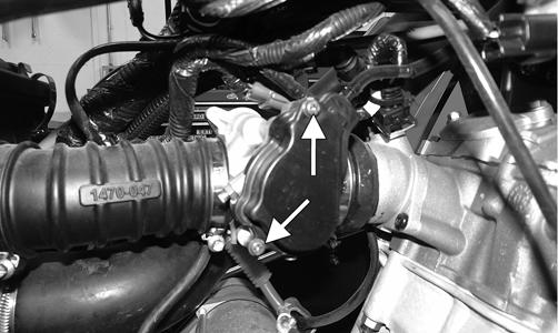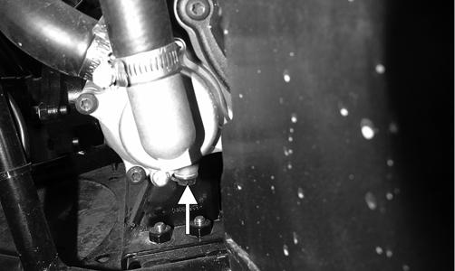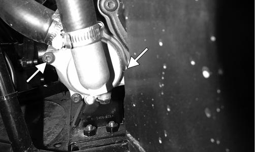 2.Drain the oil from the engine/transmission. 3.Remove the left side engine cover. 4.Loosen the hose clamps and slide the clamps away from the hose ends approximately 2 in.; then remove both hoses from the water pump. 5.Remove the two cap screws securing the water pump to the engine; then remove the water pump.