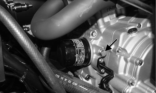 Installing 1.Secure the water pump to the engine with the two cap screws tightened securely. 2.Connect the two coolant hoses to the water pump and secure with the clamps. Tighten securely. 3.Install the left side engine cover. 4.Fill the engine/transmission with the proper amount of recommended oil.