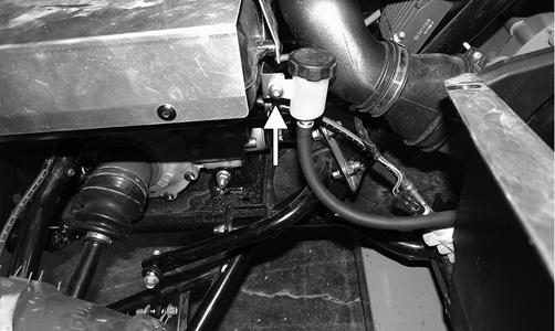 INSTALLING 1.Slide the gas tank into the vehicle from the left side. 2.Secure the master cylinder mounting bracket to the frame; then secure the master cylinder to the mounting bracket. Tighten the master cylinder nut to 12 ft-lb.