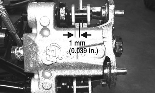 2.Measure the thickness of each brake pad. 3.If thickness of either brake pad is less than 1.0 mm (0.039 in.), the brake pads must be replaced.
