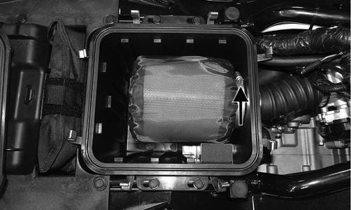 4.Using an air hose, clean the pre-filter. 5.Slide the pre-filter over the closed end of the new filter and install into the housing. Tighten the clamp securely. 6.Install the air filter housing cover and secure with the clips. 7.Install the seat.