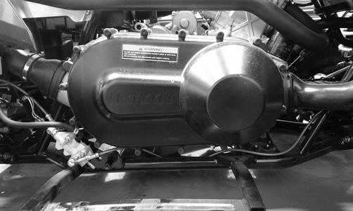 3.With the vehicle in neutral, rotate the V-belt and clutches counterclockwise until the V-belt is flush with the top of the driven pulley. 4.Place the CVT cover gasket into position; then install the cover and secure with the cap screws. Tighten the cap screws to 45 in.-lb. 5.Install the right-side footrest and brake pedal (see