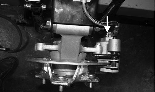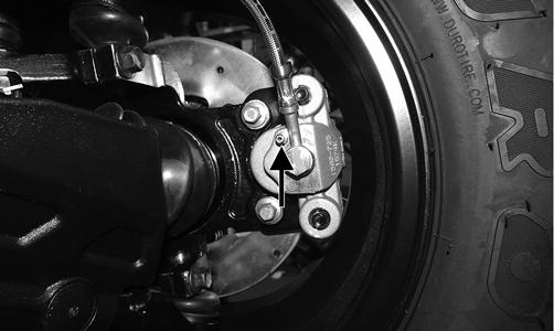 Brake Fluid; then install and secure the cover. B.Slowly compress the brake lever several times. C.Remove the protective cap, install one end of a clear hose onto the REAR bleeder screw, and direct the other end into a container; then while holding slight pressure on the brake lever, open the bleeder screw and watch for air bubbles. Close the bleeder screw before releasing the brake lever. Repeat this procedure until no air bubbles are present.