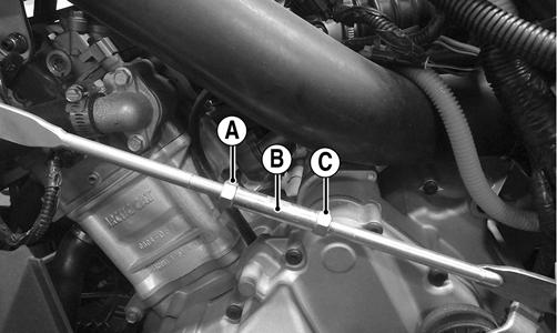 ADJUSTING SHIFT LEVER 1.Remove the seat and left side panel. 2.With the ignition switch in the ON position, loosen jam nut (A) (left-hand threads); then loosen jam nut (C) and with the shift lever in the reverse position, adjust the coupler (B) until the transmission is in reverse and the (R) icon appears on the LCD.