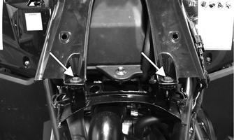 3.Place the footrest into position on the frame and loosely secure with four cap screws; then secure the front and rear fenders to the footrest with the four torx-head cap screws. Tighten the four torx-head cap screws securely; then tighten the remaining cap screws to 20 ft-lb. 4.Fill the engine/transmission with the proper amount of recommended oil. 5.Fill the cooling system with the proper amount of recommended coolant.