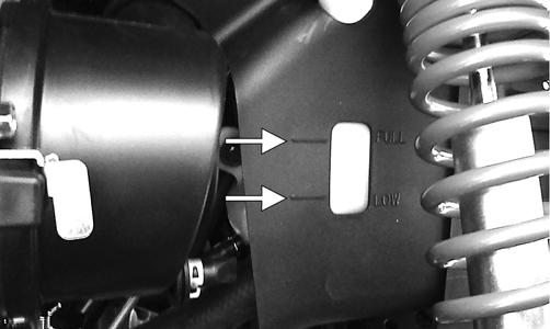 Checking/Filling 1.Locate the coolant reservoir on the right side behind the radiator. 2.Remove the cap and fill with the appropriate coolant until coolant level is between the LOW and FULL lines. Do not overfill.