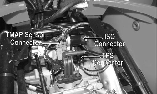 TMAP sensor connector. 4.Place the intake housing into the boots and tighten the boot clamps securely. 5.Install the gas tank; then the heat shields and seat. 6.Check throttle cable free-play (see Periodic Maintenance/Tune-Up). NOTE: If the throttle body, ECM, TPS, or ISC are