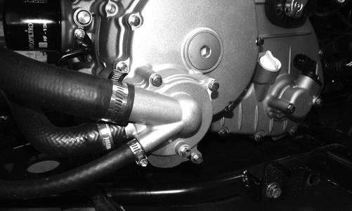Remove the footrest. 4.Loosen the hose clamps and slide the clamps away from the hose ends approximately 2 in.; then remove the hoses from the water pump. 5.Remove the four cap screws securing the water pump to the engine; then remove the water pump.
