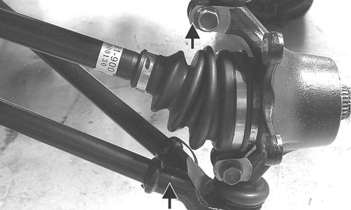 2.Remove the wheel cap from the hub; then remove the cotter pin from the nut. 3.Remove the nut securing the hub. 4.Remove the brake caliper. 5.Remove the hub assembly. 6.Remove the cotter pin from the tie rod end and remove the tie rod end from the knuckle. 7.Remove the two cap screws securing the ball joints in the knuckle. 8.Tap the ball joint end out of the knuckle; then remove the knuckle. 9.Remove the snap ring from the knuckle; then remove the bearing.