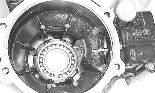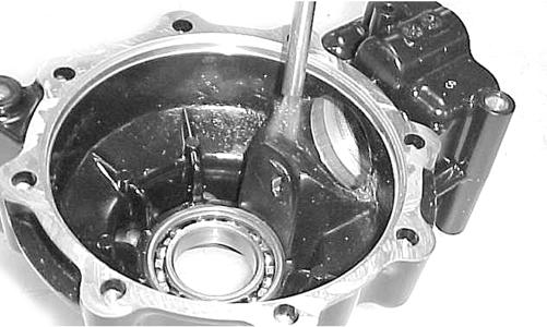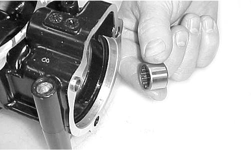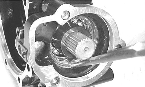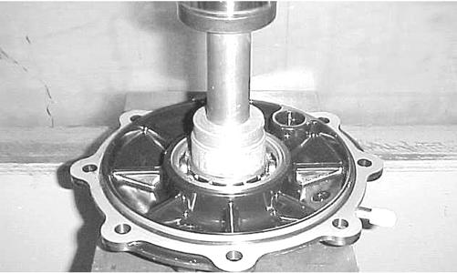 6.Remove the snap ring securing the input shaft bearing; then place the pinion housing in a press and remove the bearing.