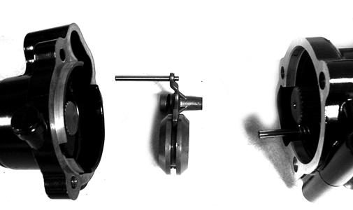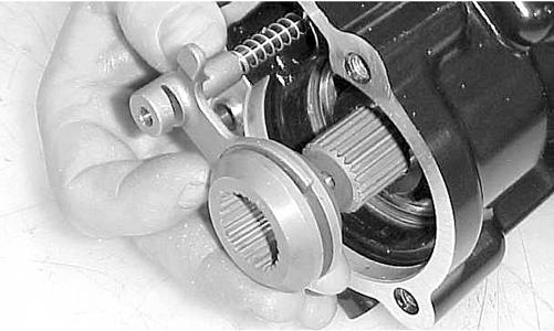 2.Using a rubber mallet, remove the housing. Account for a gasket. Remove the fork, collar, and spring.
