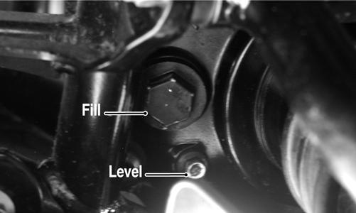 5. Install the wheels and using a crisscross pattern, tighten the wheel nuts in 20 ft-lb increments to a final torque of 40 ft-lb (steel wheel), 60 ft-lb (aluminum wheel w/black nuts), or 80 ft-lb (aluminum wheel w/ chrome nuts). 6.Remove the ATV from the support stand and release the brake lever lock. 7.Check the front differential oil level and add oil as necessary.