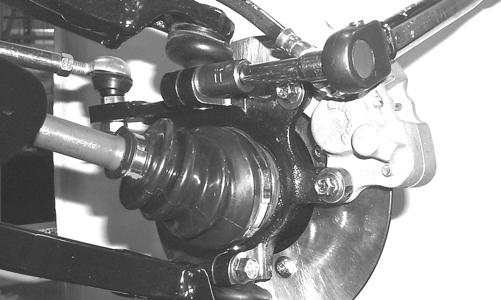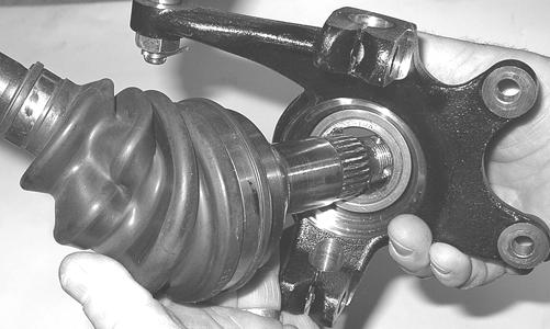 7.Remove the ATV from the support stand and release the brake lever lock. INSTALLING FRONT DRIVE AXLE 1.Position the drive axle in the gear case and steering knuckle; then insert the upper A-arm ball joint into the steering knuckle. Secure with a cap screw tightened to 35 ft-lb. 2.Slide the hub w/brake disc into position in the steering knuckle followed by a washer and hex nut.