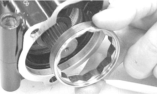 Failure to completely remove the staked material from the lock collar will result in the destruction of the threads in the gear case housing.