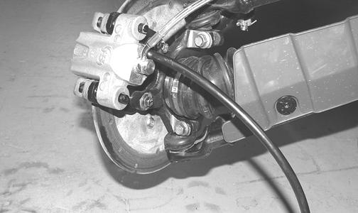 REMOVING 1.Slide a piece of flexible tubing over one of the wheel bleeder valves and direct the other end into a container. Remove the reservoir cover; then open the bleeder valve. Allow the brake fluid to drain completely. NOTE: Compressing the brake lever several times