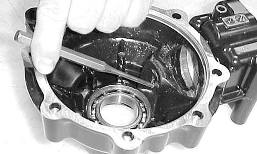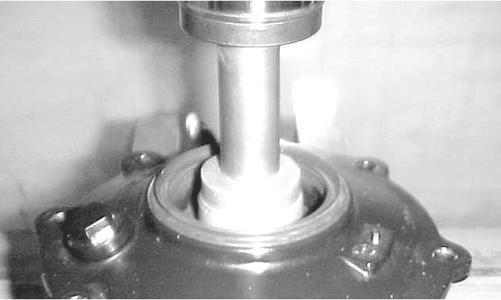 6.Remove the snap ring securing the input shaft bearing; then place the pinion housing in a press and remove the bearing.