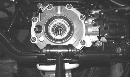 The front drive actuator is located on the side of the front drive input housing. With the engine stopped and the ignition switch in the ON position, a momentary “whirring” sound can be heard each time the front drive selector switch is shifted. If no sound is heard, see Electrical System. If the actuator runs constantly or makes squealing or grinding sounds, the actuator must be replaced. REMOVING 1.Disconnect the connector on the actuator harness. 2.Remove the mounting cap screw from the driveshaft side of the actuator.