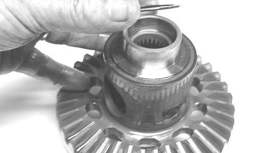 4.Place the differential with the open side down; then lift the housing off the spider assembly. Account for shim(s) and mark as right-side.