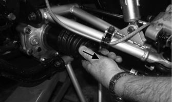 7.Remove the ATV from the support stand and release the brake lever lock. INSTALLING FRONT DRIVE AXLE 1.Position the drive axle in the gear case and steering knuckle; then insert the upper A-arm ball joint into the steering knuckle. Secure with a cap screw tightened to 35 ft-lb. 2.Slide the hub w/brake disc into position in the steering knuckle followed by a washer and hex nut.
